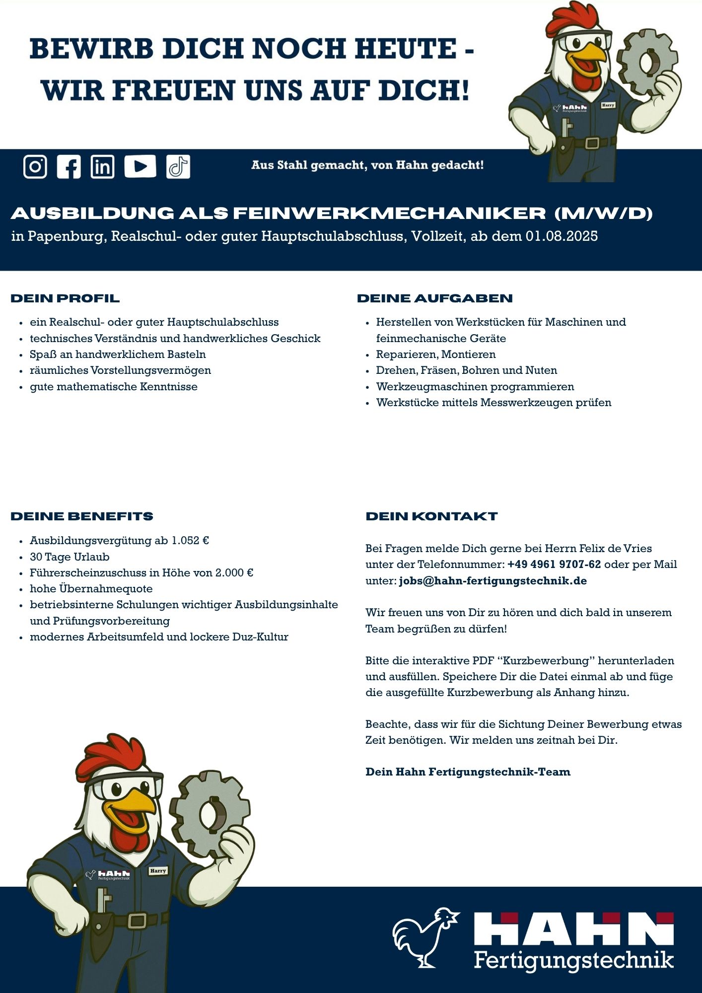 +49 4961 9707-62 oder per Mail unter: jobs@hahn-fertigungstechnik.de